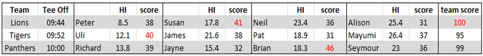 After some last minute changes to the team set up, due to traffic problems hitting two of the players, three teams of 4 players teed off, playing