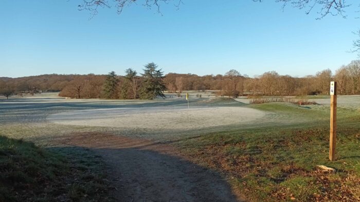 A bitterly cold morning with a heavy frost on the ground made golf a whole new experience, with tremendous run on the ball and uncontrollable bounces. As the sun shone throughout the morning the course turned from white to green by around 11.30am, except for those areas within the shade, and there was hardly a breathe of wind. A view of the 3rd hole at around 10am is attached.